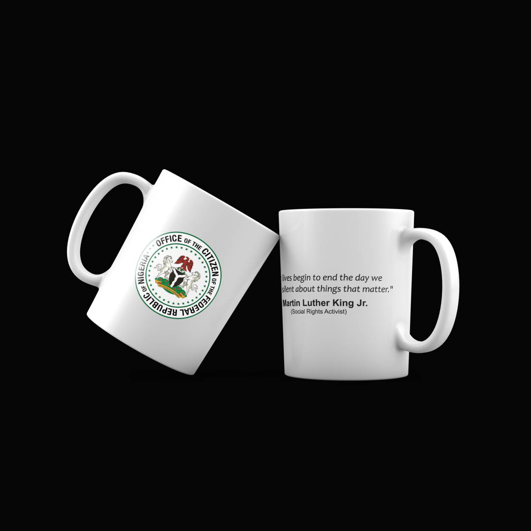 This white ceramic mug features the Office of the Citizen of the Federal Republic of Nigeria seal on one side and an empowering quote by Martin Luther King Jr. on the other: